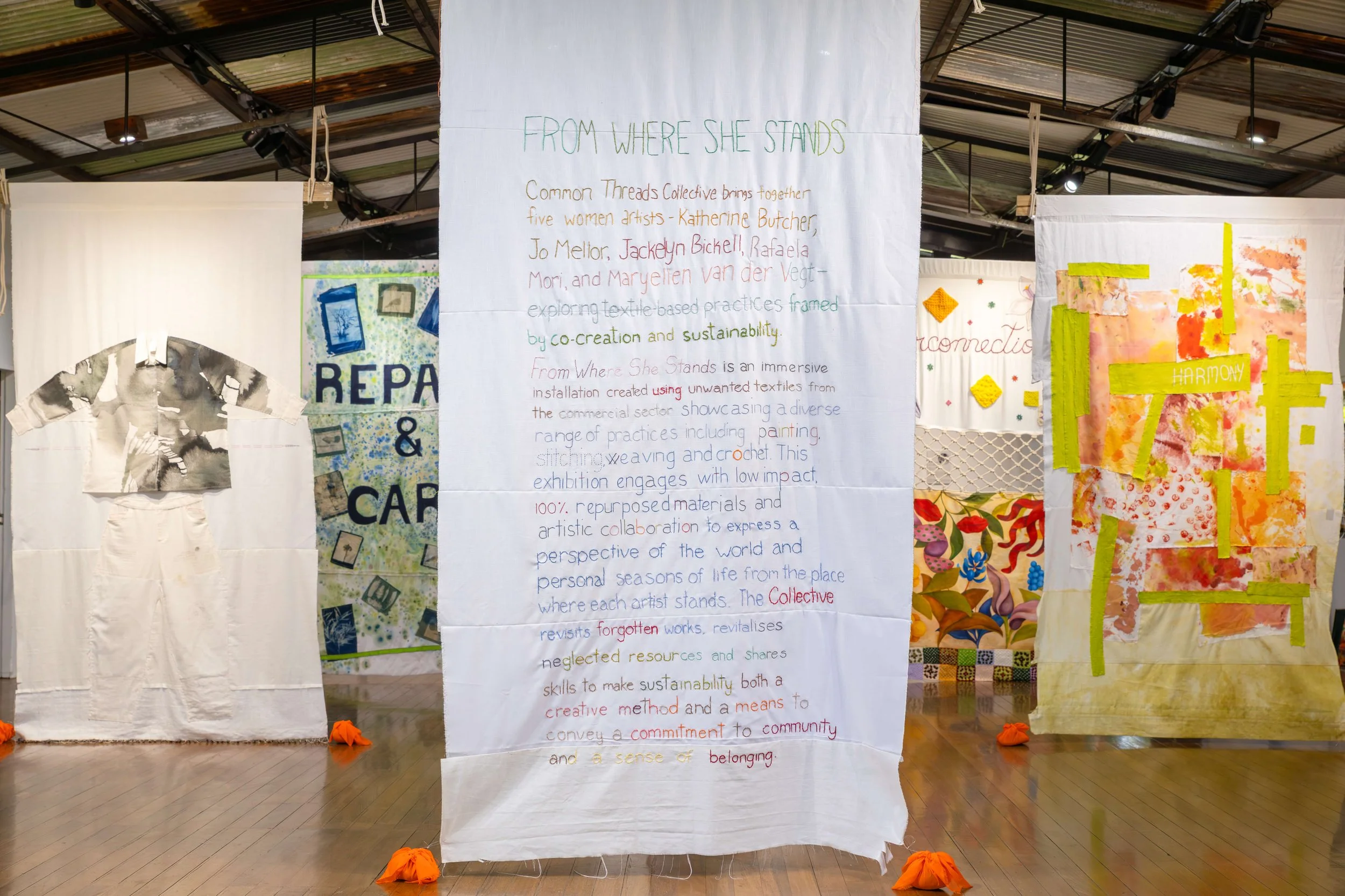 From Where She Stands is an immersive and dynamic installation experience, created using unwanted textiles from the commercial sector showcasing a diverse range of practices including painting, stitching, weaving and crochet. This exhibition engages with low-impact, 100% repurposed materials and artistic collaboration to express a perspective of the world and personal seasons of life from the place where each artist stands. The Collective revisits forgotten works, revitalises neglected resources and shares skills to make sustainability both a creative method and a means to convey a commitment to community and a sense of belonging.